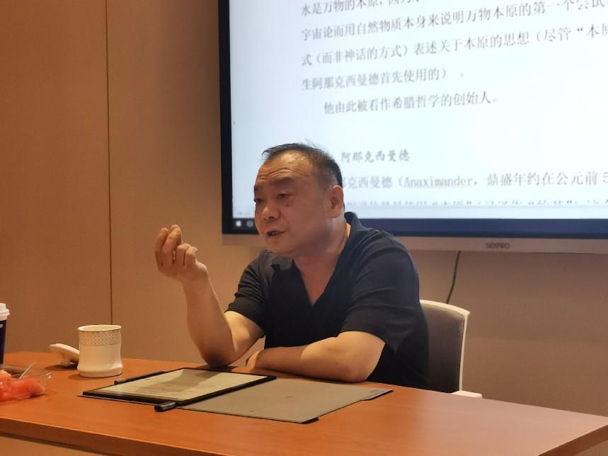 鉴传今教授从介绍“哲学”一词的词源开始,他指出该词由日文转译而来,而哲学的英文单词“philosophy”则源自古希腊文“philosophia”,原义为“爱智慧”。鉴传今教授借用康德的三个问题:“我是谁?”“我能期望什么?”“我能知道什么?”作为展开。探讨了古希腊哲学关注的基本问题。鉴教授指出,对于人或他人的认识问题,在“我—它”语境中,人与自我之外的世界是完全对立的;而探讨“我与你”(马丁·布伯)则更能突出对话的价值取向。“我—它”是客观存在,而“我与你”更关注能否共存,显示出了两种不同的态度和价值趋势。而了解自己必须了解世界。追问“世界是什么?”即是探讨“存在”的问题。存在论认为,存在是一种本质性,是高度抽象的。鉴老师探讨了“存在”(Being)一词的中文翻译,介绍了“是”“万有”等不同译法间的差异。他认为“是”区别于“存在”的本质性内涵,而“万有”则更多借鉴了中华传统道家思想中“万物万有”的固有概念。