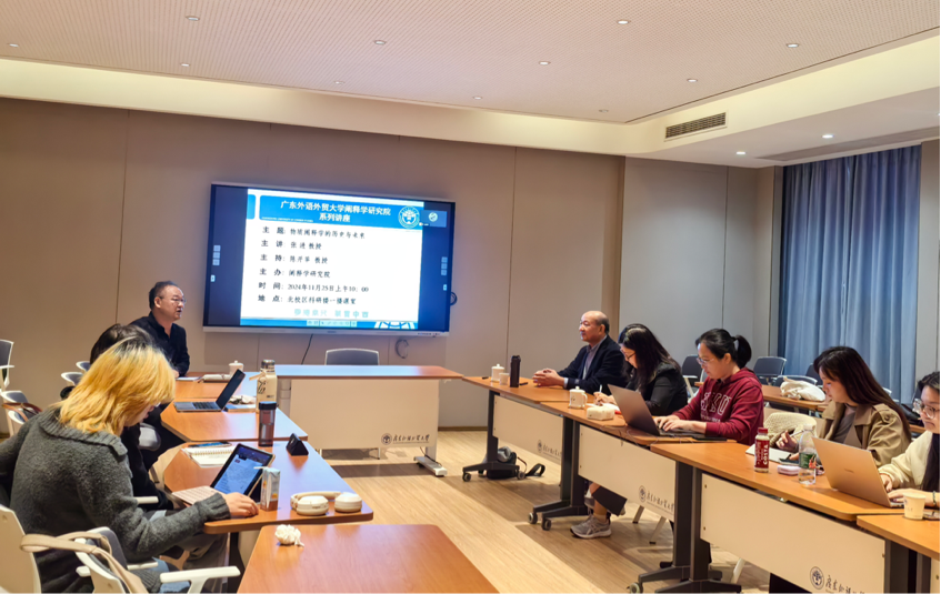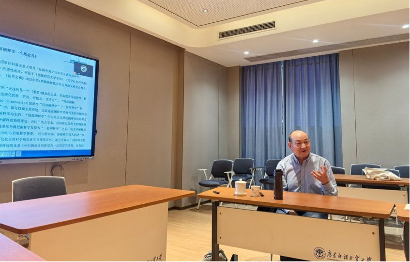 2024年11月25日上午,兰州大学文学院文艺学研究所所长张进教授受邀在白云山校区科研楼一楼会议室举办了主题为“物质阐释学的历史与未来”的学术讲座。本次讲座由广东外语外贸大学主办,阐释学研究院院长陈开举教授主持,吸引了众多师生前来聆听。