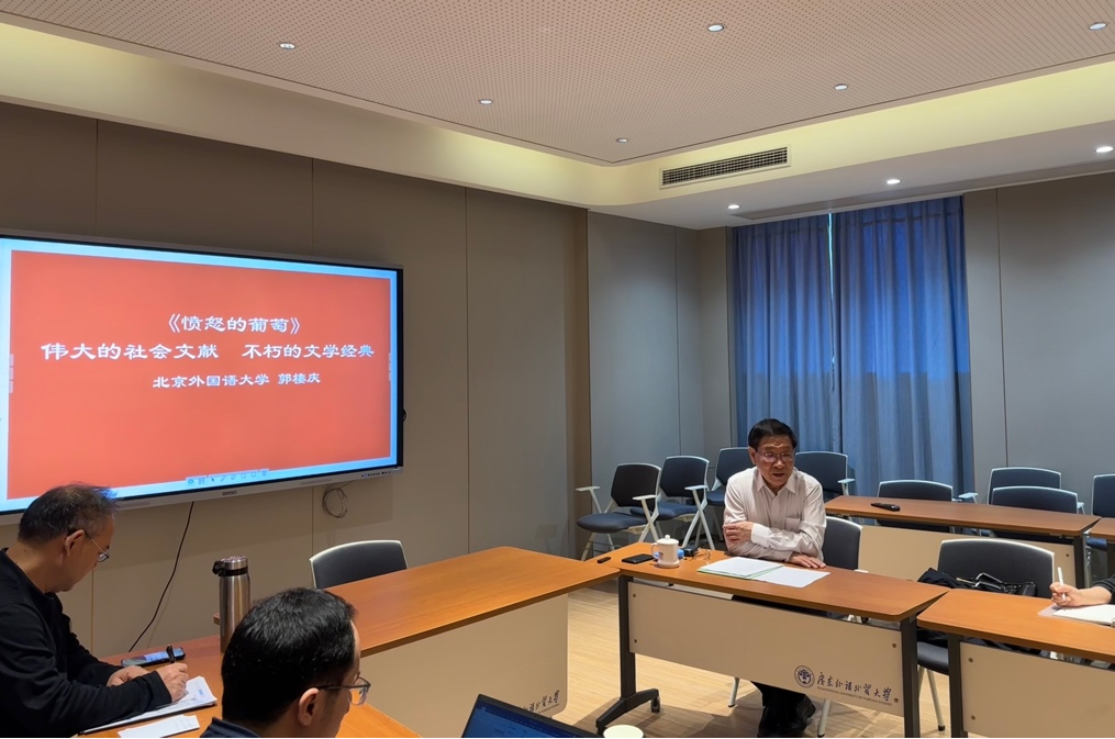 郭棲庆教授表明此次讲座主题围绕美国文学经典《愤怒的葡萄》展开研讨。美国诺贝尔文学奖得主约翰·斯坦贝克的名著《愤怒的葡萄》是美国20世纪30年代的历史记载和历史写照,是了解当时美国社会状况和人民生活及思想的一个窗口,是一部伟大的社会文献。郭教授认为不同于新批评的研究思路,文学是社会学也是历史学,文学作品承载着历史的变迁。文学作品是一面镜子,读者及文学批评家应该了解历史并解读历史,解读文学作品的意义。